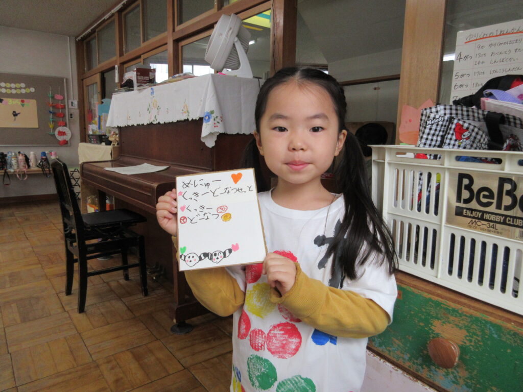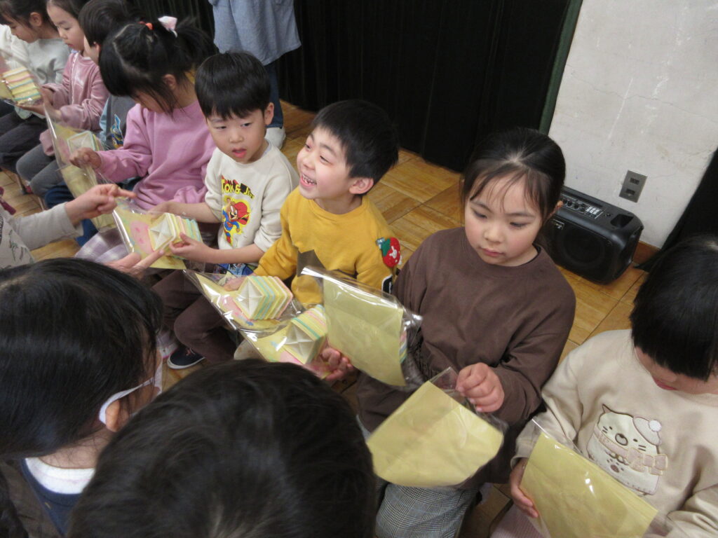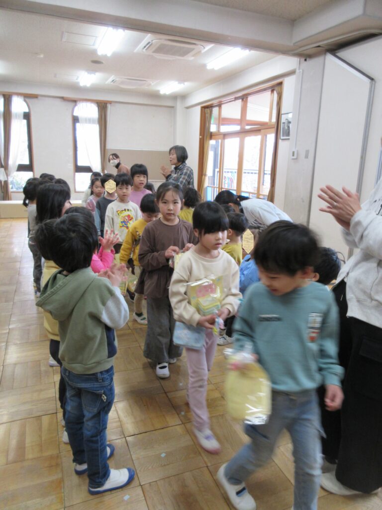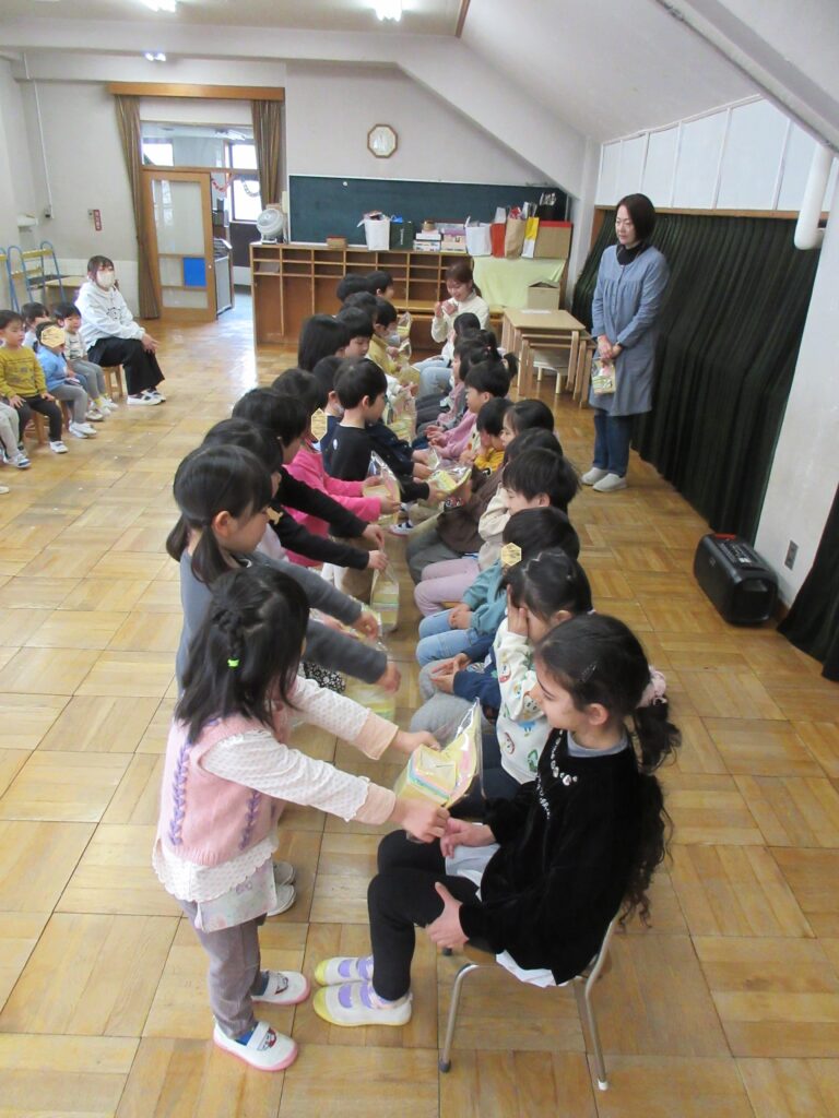 おわかれ会では、小さい組の人たちが、「今まで本当にありがとう!学校に行っても忘れないでね。」の気持ちをこめて、ペン立てとキーホルダーをプレゼント!