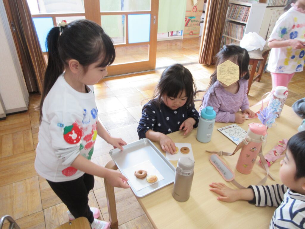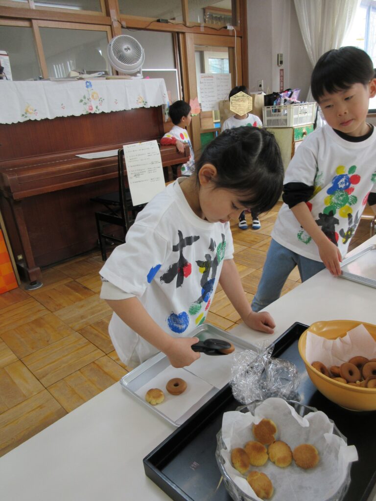 ゆりぐみカフェではドーナツとクッキーがふるまわれました。買い出しから始まり、メニュー作り、セッティングから接客にいたるまで年長組の子ども達が担いました。