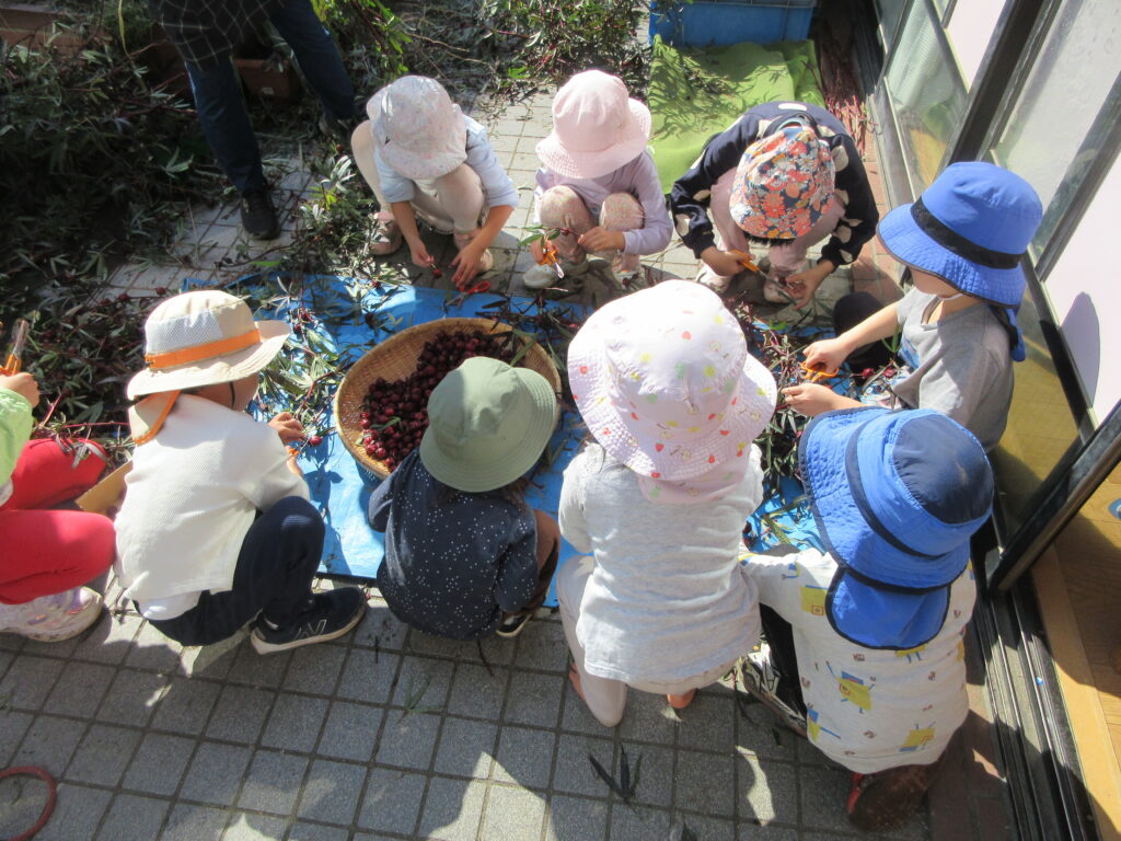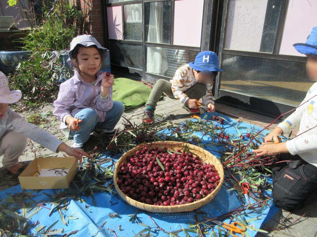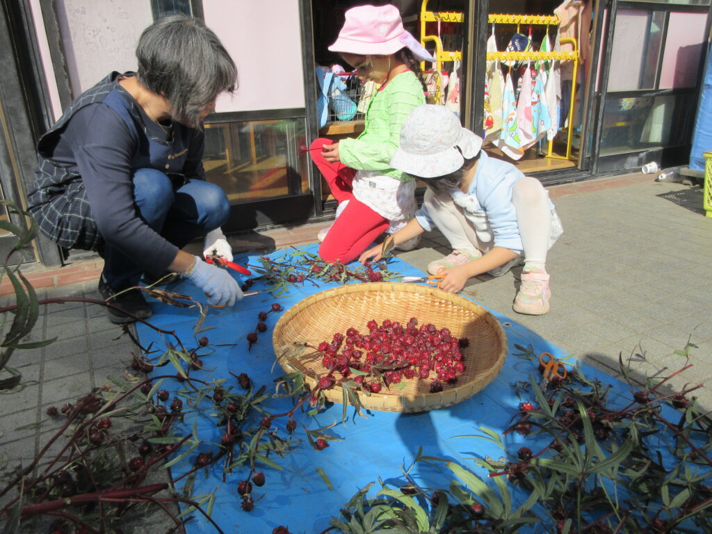 ジャム作りのため、園庭のローゼルの実(がくの部分)も収穫もしました。