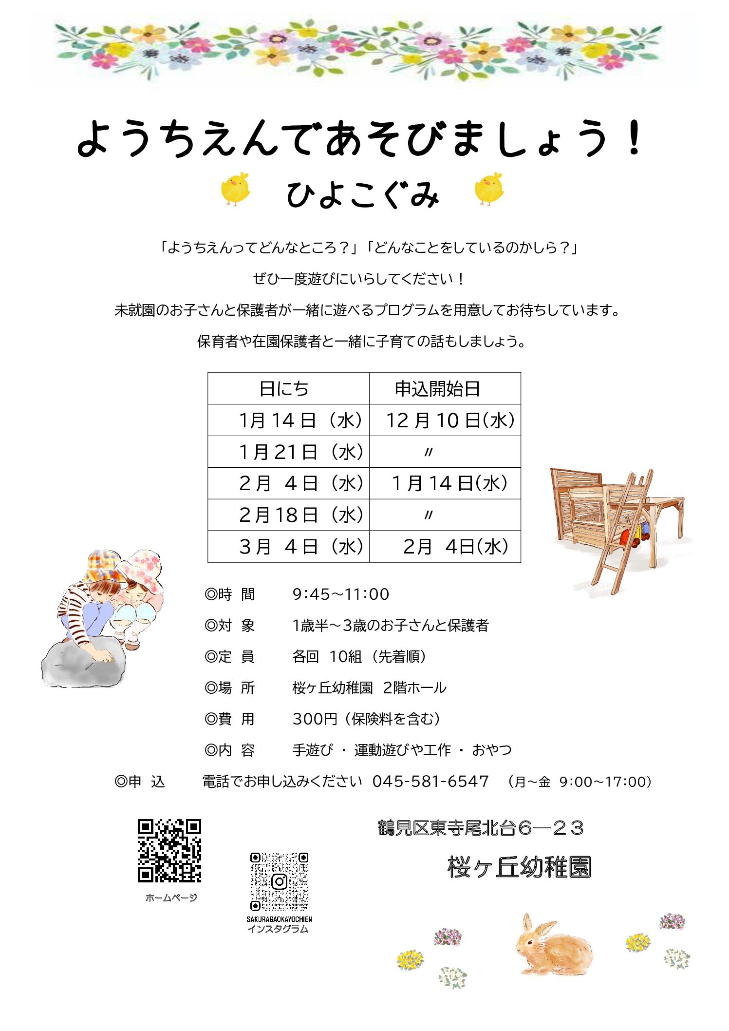 10月15日(水)より、2026年度入園願書配布を開始いたします。(1部200円)2026年度中に満3歳児で入園を希望する方も今回の対象となります。見学、ご質問等、随時お受けしておりますので、お気軽にお問い合わせください。☎045-581-...